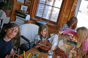 Most of our children were home birthed and are homeschooled — ages four years to eighteen. Swimming in our pond, trampolining, tobogganing, snowshoeing, folk dancing, ecstatic dancing, crafting/mending nights, new-moon women’s circles, music jams, and potlucks are some of the things we do for fun. We all share a love of nature, music and the arts.